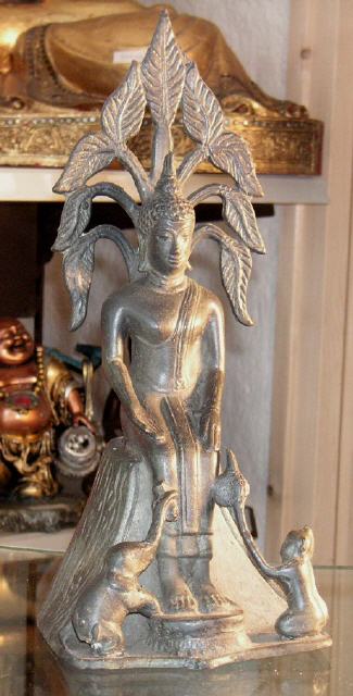 Thai Buddha-Statue Bronze-Messing, 27 Cm/H. Diese Statue erinert an Siddhartha Gautama, an seine Aufenthal im Wald versorgt wurde von Wilde Tiere mit früchten.