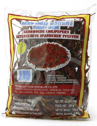 Thai Chili mittel groß getrocknet "Prik-Häng-Yhai", thailändische mittele große getrochnet, getrocnte Thai-Chili gross. Verpack, Import aus Thailand